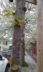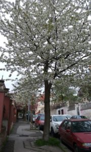 Sakura je odrůda okrasné třešně a je opravdu krásným stromem, a to v každém ročním období. Má svoje místo v klidných obytných a širokých ulicích. Sakury bohužel nežijí právě nejdéle, ale při dobré péči mohou běžně dosahovat stáří kolem 50 let. Jak staré byly naše Sakury v Olšinách, se z dendrologického průzkumu1 bohužel nedozvíme. První z nich byly pravděpodobně vysazené v době, kdy probíhala stavba okolních budov. Sakury potřebují pravidelnou kontrolu, hlavně z důvodu lámavosti dřeva, což platí pro třešně obecně. Okrasné třešně jsou navíc většinou naroubované na ptačí třešeň. Při špatné údržbě se pak stává, že se podloží probojuje, vítězí nad naroubovanou odrůdou a ohrozí stabilitu celého stromu (nehledě na to, že už není tak krásné). Na území Prahy 10 jsou minimálně dvě další aleje okrasných třešní, kterým je potřeba rychle pomoci, a to na Vinohradech. Jedna se nachází v Hradešínské ulici, druhá v Dykově ulici. Pro ilustraci přikládám několik fotografií z loňského roku z Hradešínské ulice.